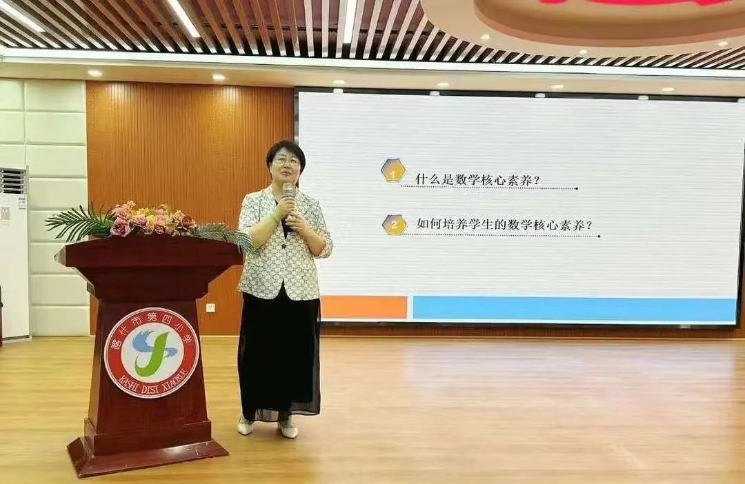 5月29日,喀什市150余名数学骨干教师齐聚喀什市第四小学,观看了周桂玲老师和该校国培参训学员赵志惠老师的同课异构课程《平均数》,以及周老师专题讲座《怎样在课堂教学中渗透核心素养》。葛文双为本次活动做总结,他希望数学教学要多从身边的资源、多从身边的实例、多从孩子的角度去探究和教授。他希望大家不断追求专业发展,不断超越自己,奋力彰显新时代教育家精神。