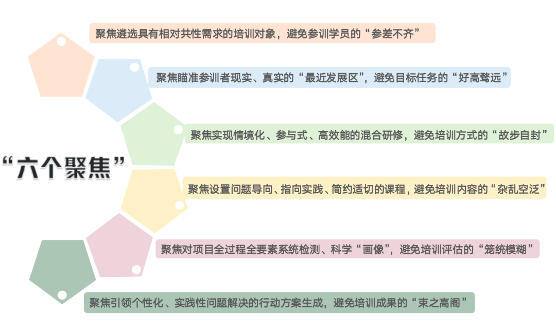 “以学员为中心”的精准培训模式,首先强调以学员为中心,最大限度地激发学员内在的学习动机,培训者根据学员的需求、特质、动机与意愿,精准创设合适的学习活动,营造学习氛围,使培训最大程度地满足学员的真实需求,让学员从被动学习变成主动学习。其次是强调精准培训,主要体现在“六个聚焦”:聚焦遴选具有相对共性需求的培训对象,避免参训学员的“参差不齐”;聚焦瞄准参训者现实、真实的“最近发展区”,避免目标任务的“好高骛远”;聚焦实现情境化、参与式、高效能的混合研修,避免培训方式的“故步自封”;聚焦设置问题导向、指向实践、简约适切的课程,避免培训内容的“杂乱空泛”;聚焦对项目全过程全要素系统检测、科学“画像”,避免培训评估的“笼统模糊”,聚焦引领个性化、实践性问题解决的行动方案生成,避免培训成果的“束之高阁”。